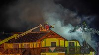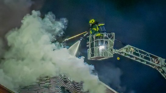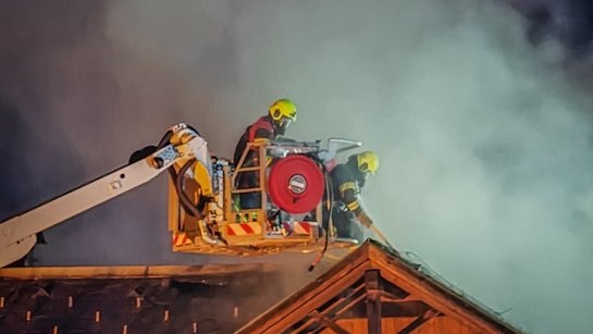 Die Intensität des Brandes erhöhte sich, mittels der Teleskopmast Bühne der FF Spital und der Drehleiter Kirchdorf wurden zwei DRILL-X (Bohrlöschgeräte) in Stellung gebracht um nicht zugängliche Dachbodenabschnitte zu löschen.