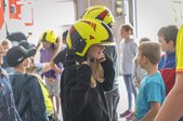 Ein erstes Highlight war das Anprobieren der Feuerwehrausrüstung. Die Kinder konnten dabei selbst erleben, wie schwer ein Feuerwehrhelm und die Schutzbekleidung sind – ein beeindruckender Moment für viele.